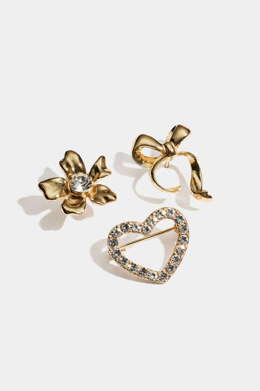 3-pak brocher i guldfarvet metal. Leveres med en sløjfe, en blomst og et hjerte med glassten.
