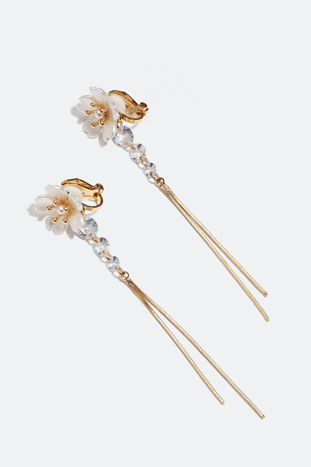 Clips-øreringe i guldfarvet metal med hvide blomster og vedhæng lavet af glassten og led. Et par dekorative øreringe, som passer perfekt til dig, der ikke har huller i ørerne.