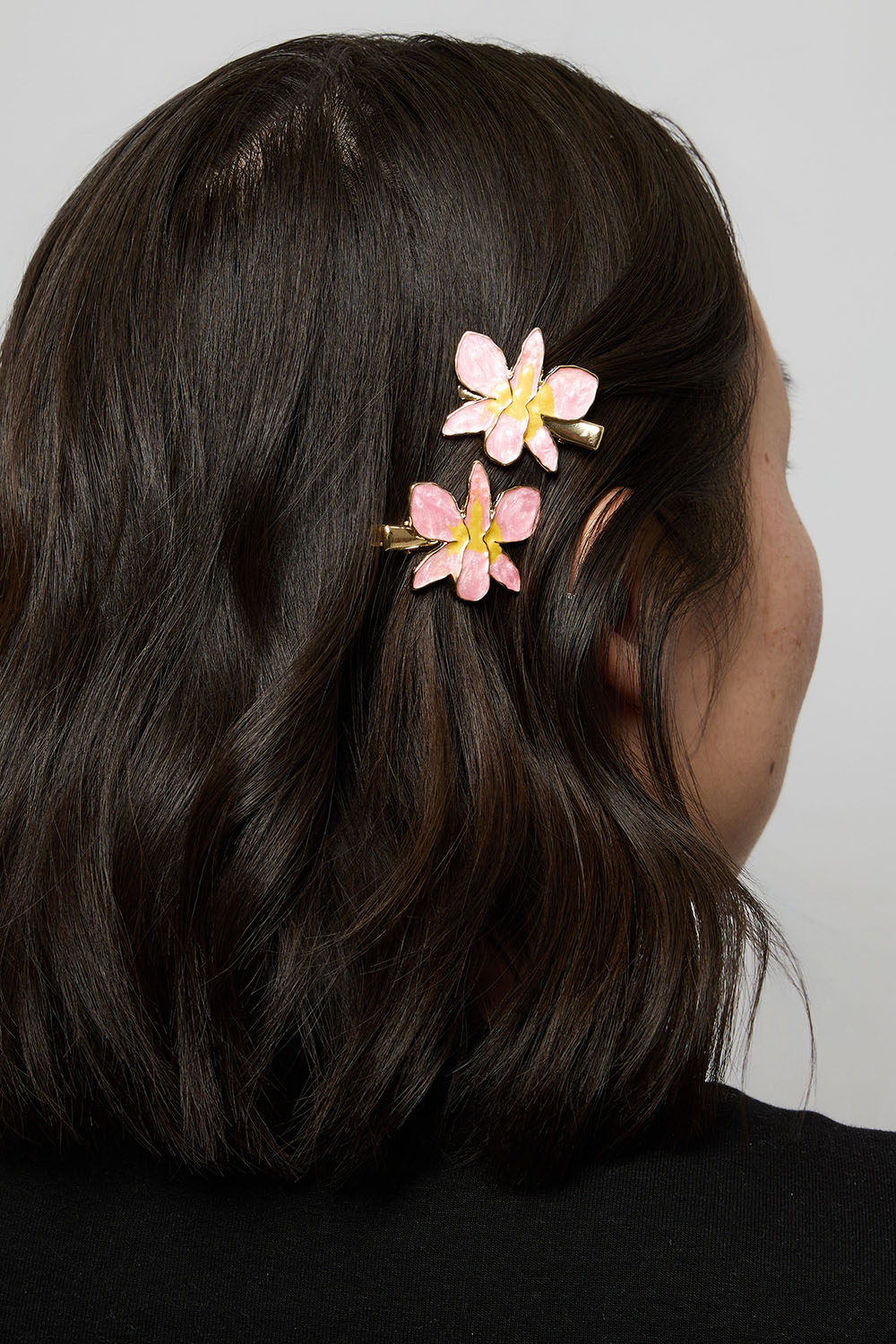 2-pak hårspænder i guldfarvet metal med rosa blomster.