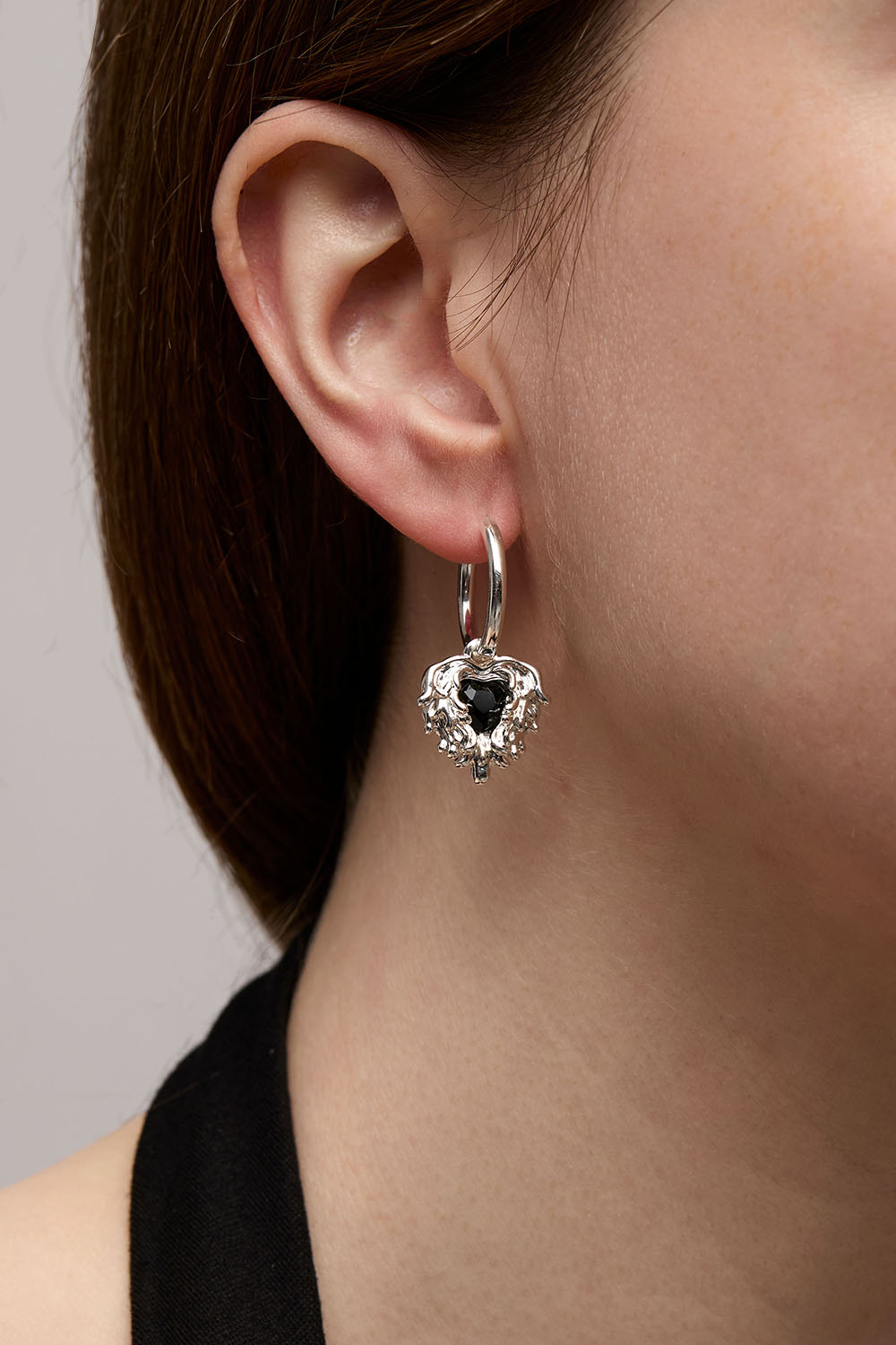 Hoops med hængende hjerter i smeltet design og sort glassten.