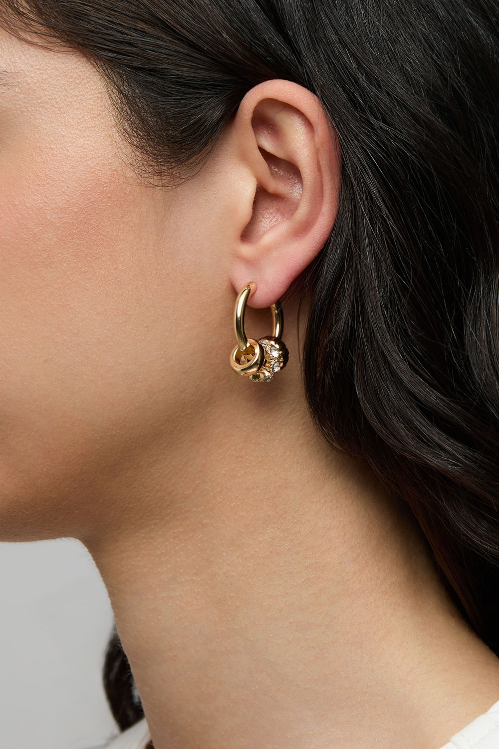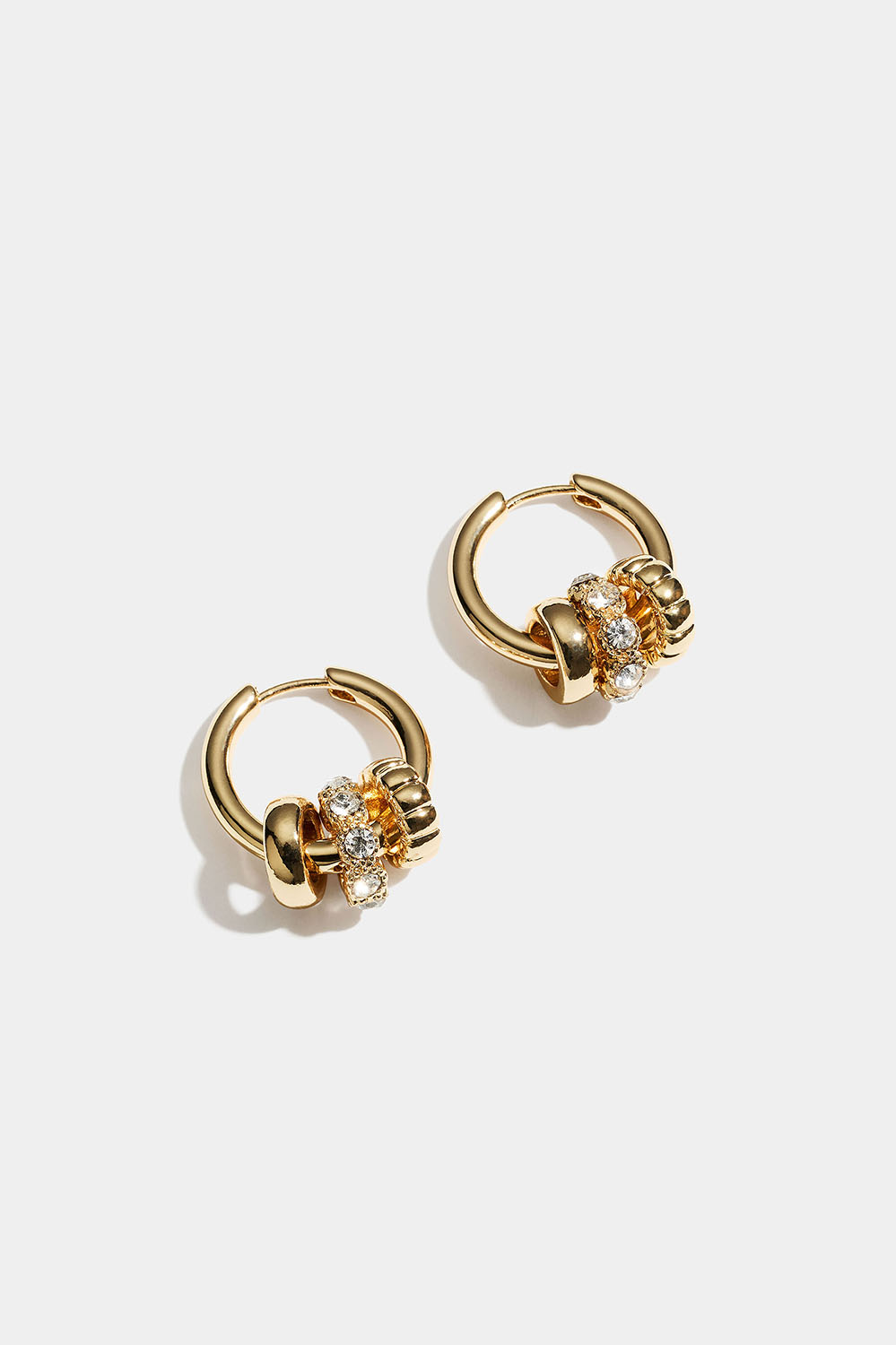 Hoops i guldfarvet metal med tre runde dekorative vedhæng. Øreringene kommer med en glat, en ribbet og en glitrende glassten.