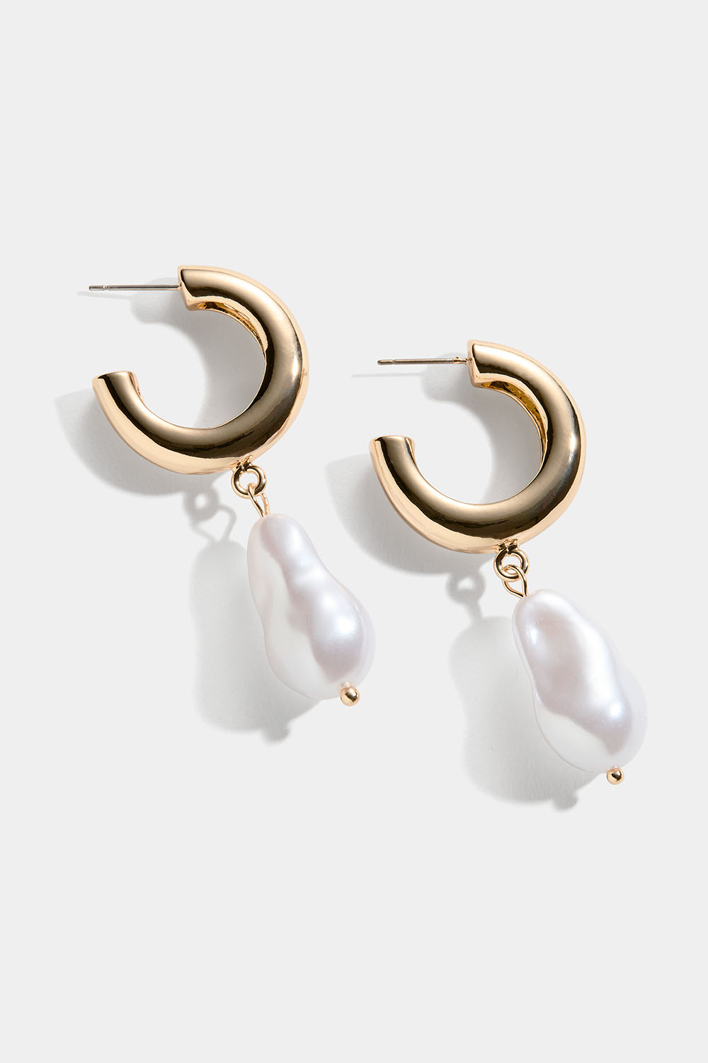 En bred, guldfarvet hoop med en stor hængende perle i en organisk form.
