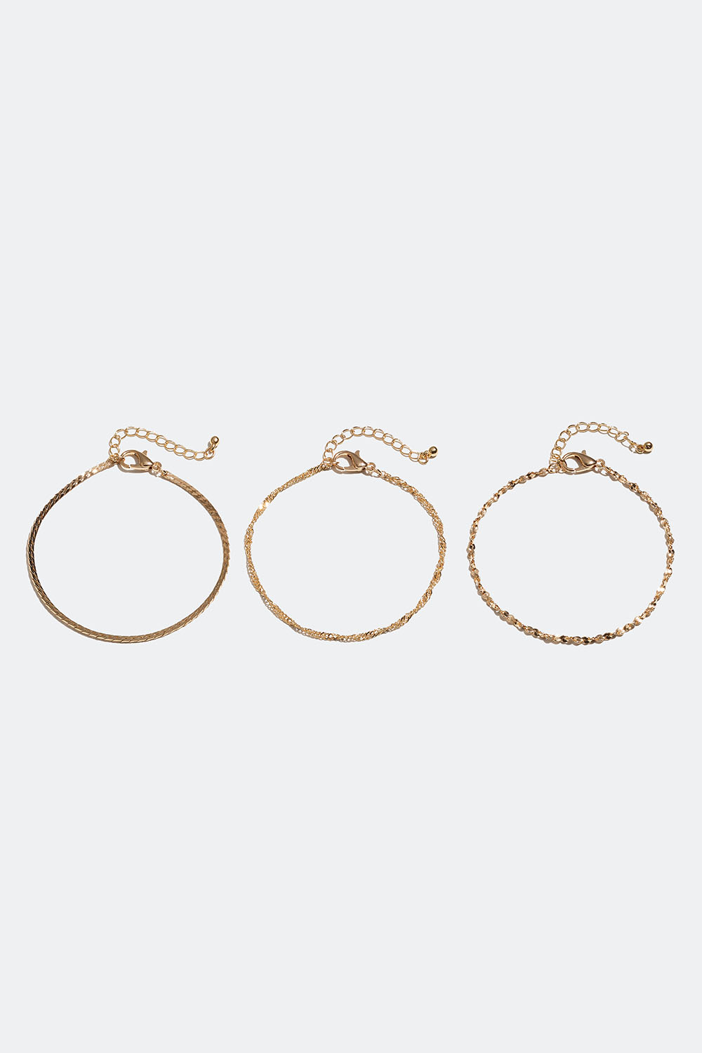 3-pak armbånd i guldfarvet metal med forskellige kæder. Tre par stilrene kædearmbånd, der passer til alle lejligheder og kan bruges både sammen eller hver for sig.