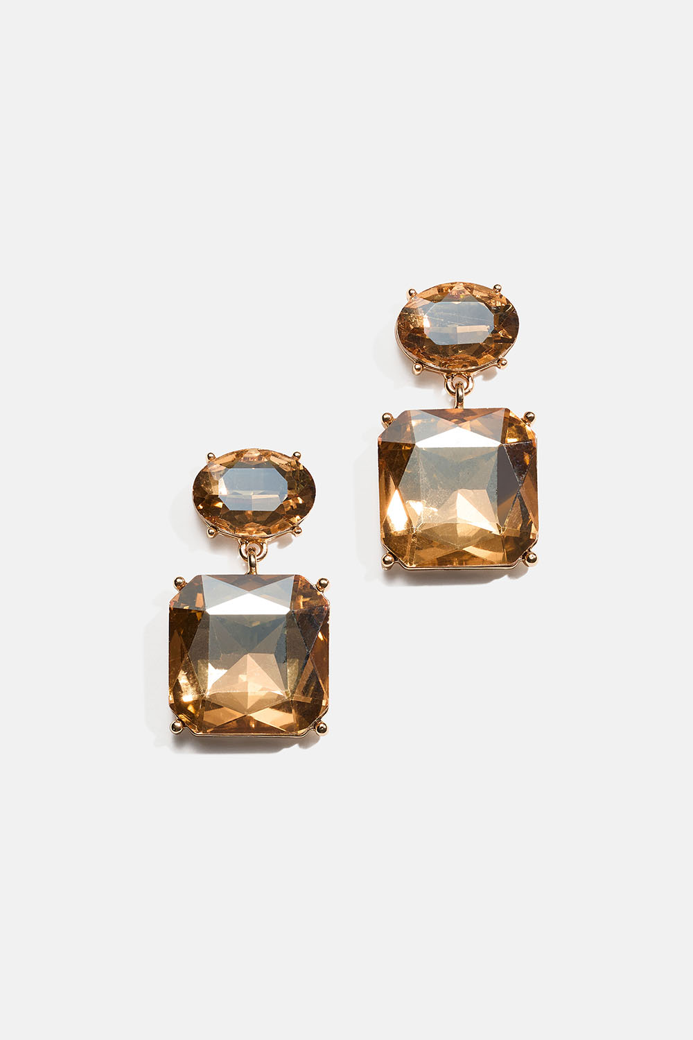 Øreringe i guldfarvet metal med store ovale og firkantede glassten.