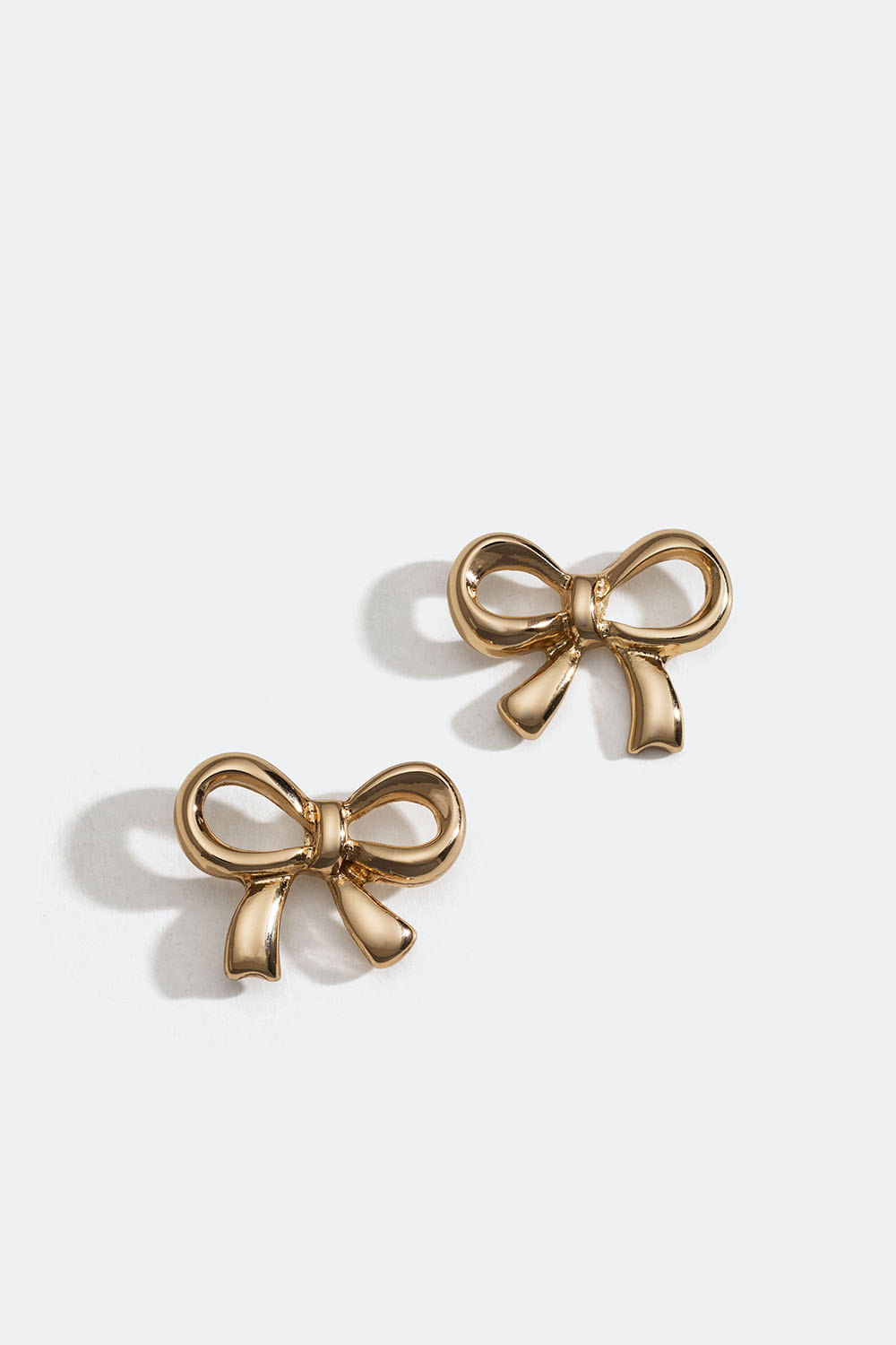 Små dekorative øreringe i guldfarvet metal i form af sløjfer.