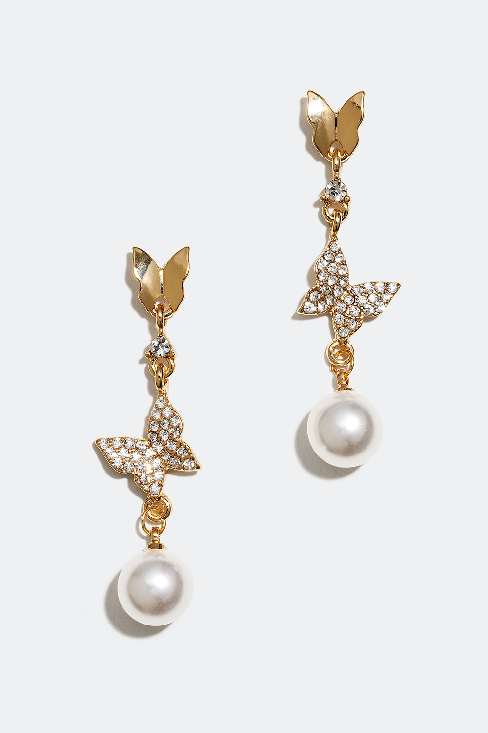 Guldfarvede øreringe med hængende sommerfugle og en rund perle, hvoraf den ene er dekoreret med glassten. Et par dekorative øreringe med glitrende detaljer, der passer til både hverdag og fest.