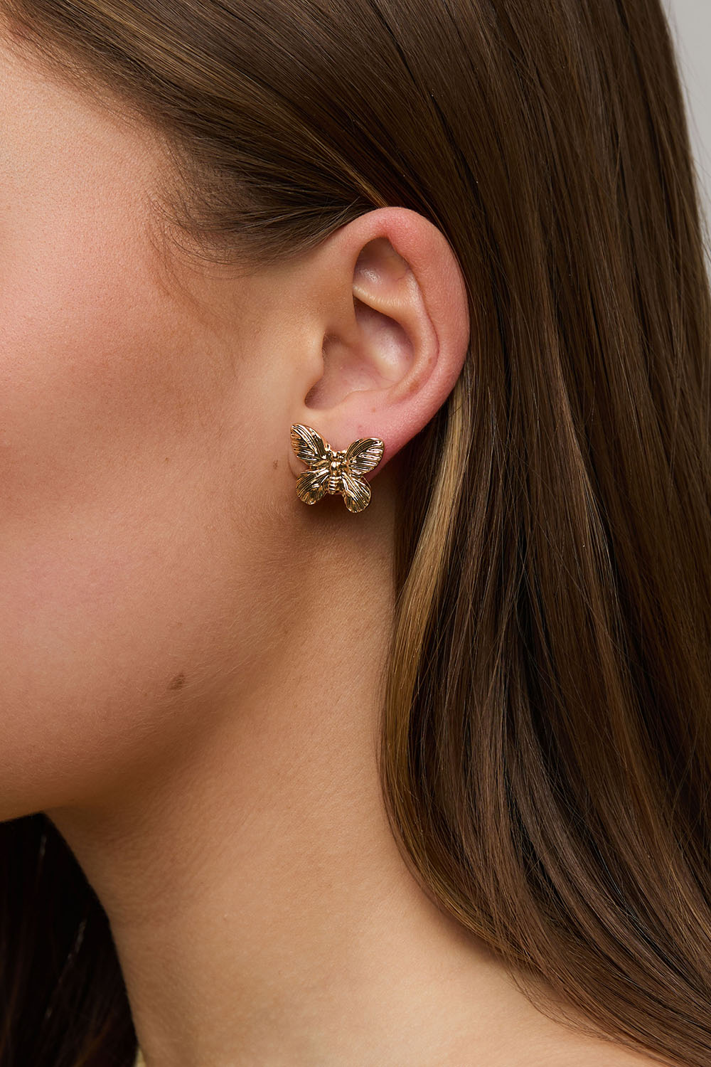 Øreringe i guldfarvet metal i form af sommerfugle med strukturerede detaljer.