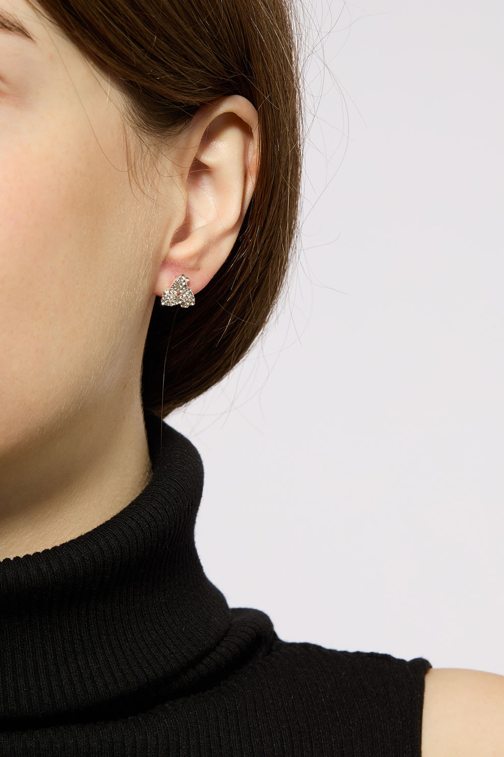 Ørestikker i guldfarvet metal med trekantet knudedesign dekoreret med små, hvide glassten.