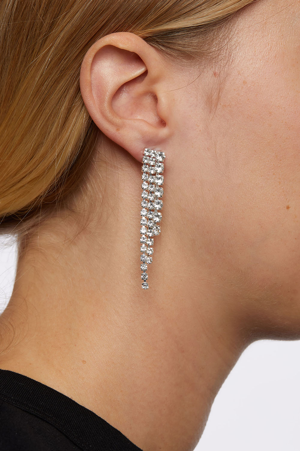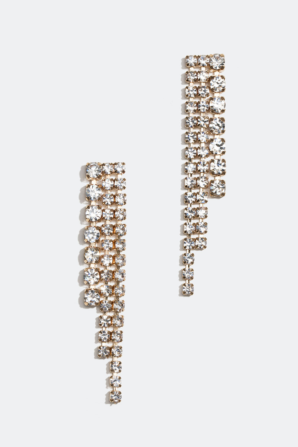 Øreringe i guldfarvet metal med tre led i forskellige længder dekoreret med runde glassten i forskellige størrelser. Perfekte rhinsten-øreringe til festlige lejligheder.