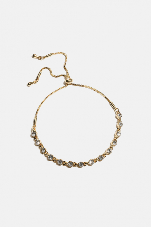 Armbånd i guldfarvet metal med en tynd kæde dekoreret med små runde glassten. Længden kan justeres ved hjælp af en gummibelagt guldperle.