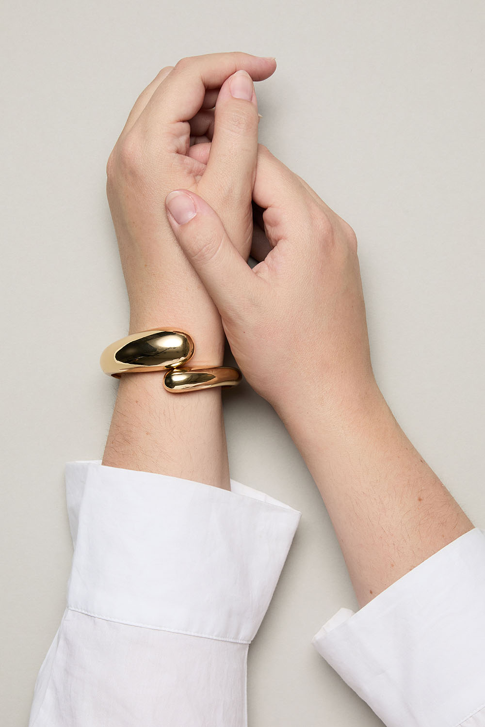 Statement-armbånd med afrundede former i guldfarvet metal.