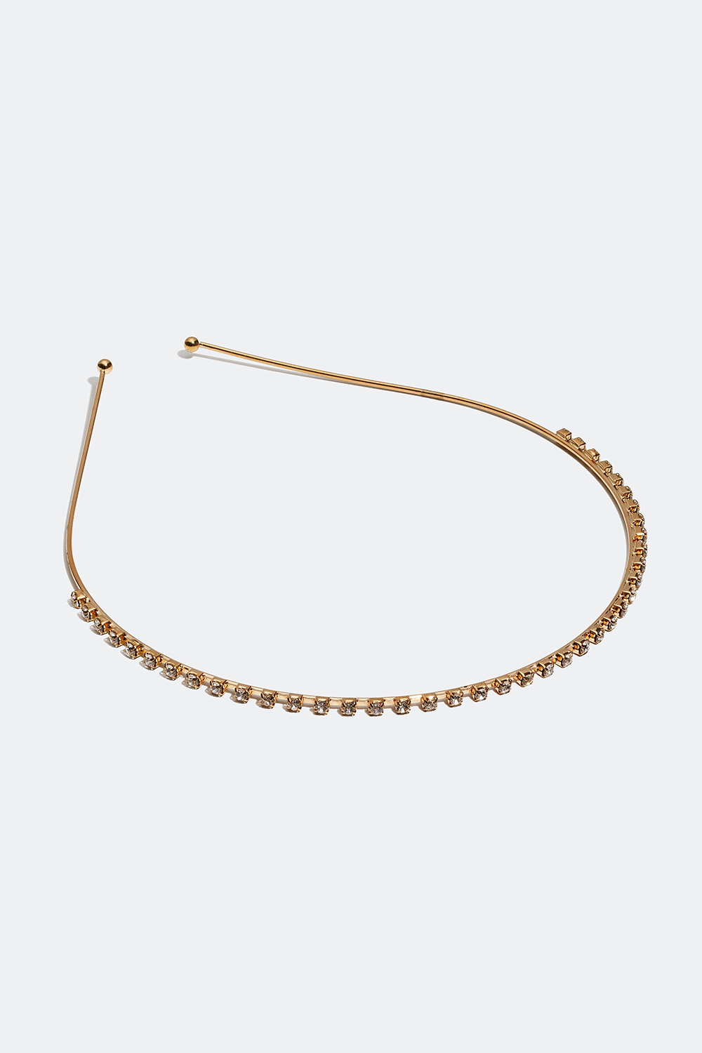 Smalt diadem i guldfarvet metal, som er dekoreret med små glassten foroven. Et glitrende diadem med et enkelt design, som passer perfekt til festlige lejligheder, hvis du gerne vil kaste lidt glimmer over dit outfit.