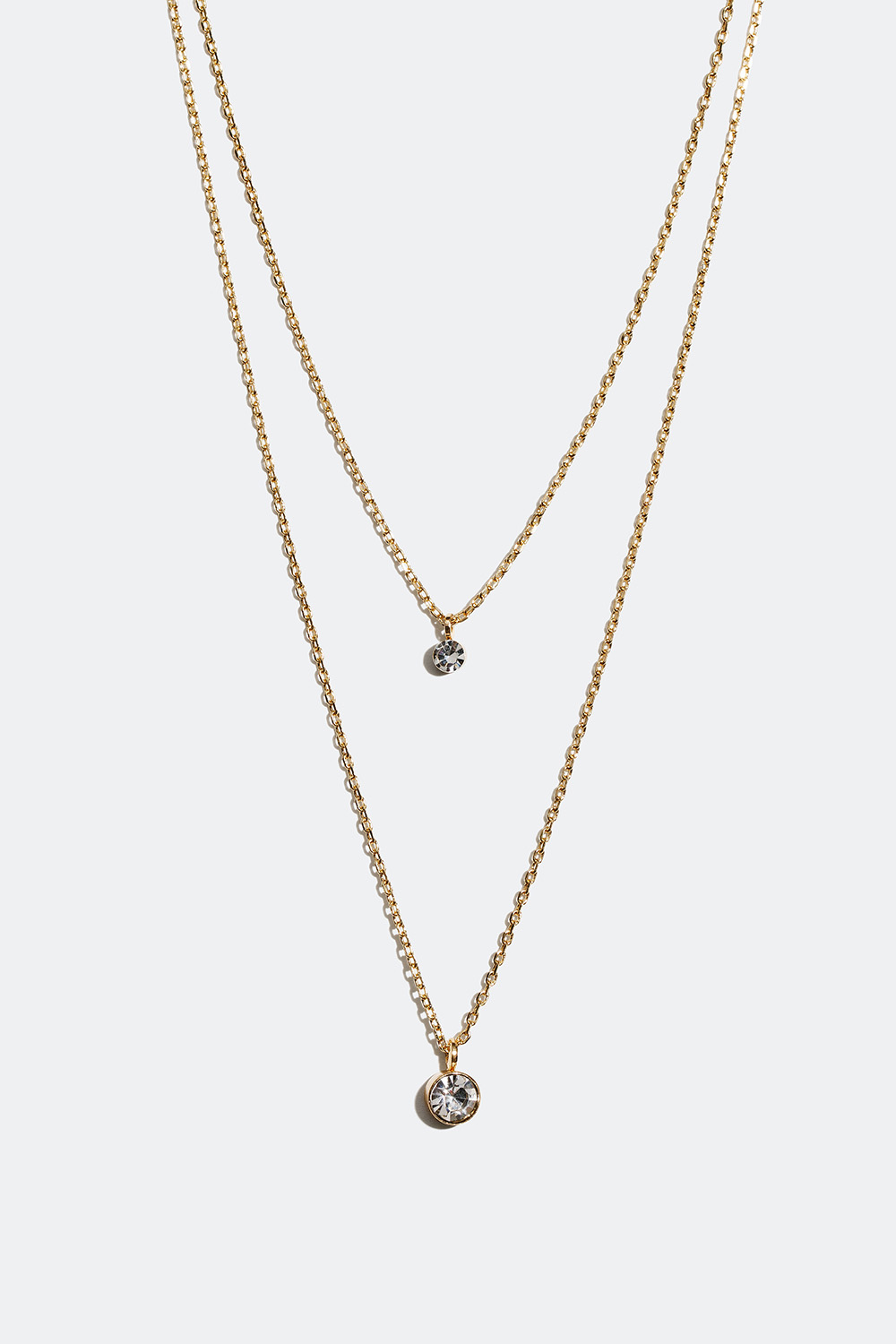 Dobbelthalskæde i guldfarvet metal med to kæder af forskellig længde, hver dekoreret med et vedhæng af en lille rund glassten. En stilren halskæde med glitrende detalje, der passer til både hverdag og fest. Kæderne fastgøres i samme lukkeanordning og kan ikke bruges hver for sig.