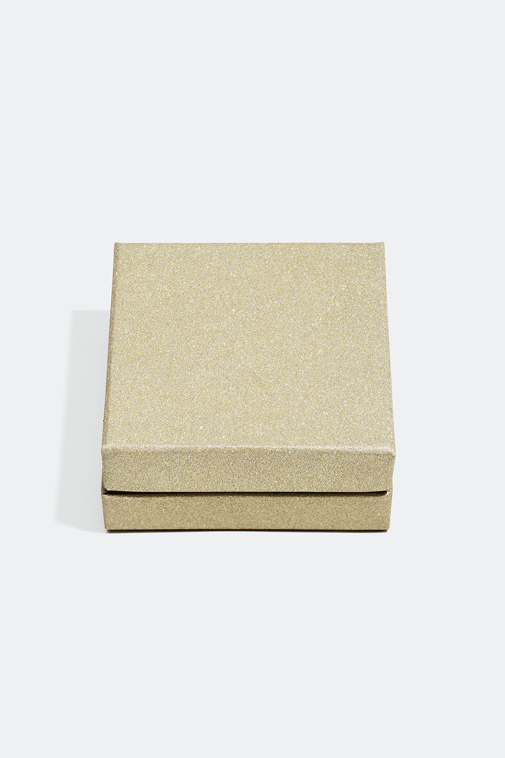Gaveæske i pap med guldglimmer. Indeni er der plads til at fastgøre øreringe, ring og halskæde. Perfekt æske til at give smykker væk som gave til f.eks. jul, fødselsdage, mors dag og dimission.