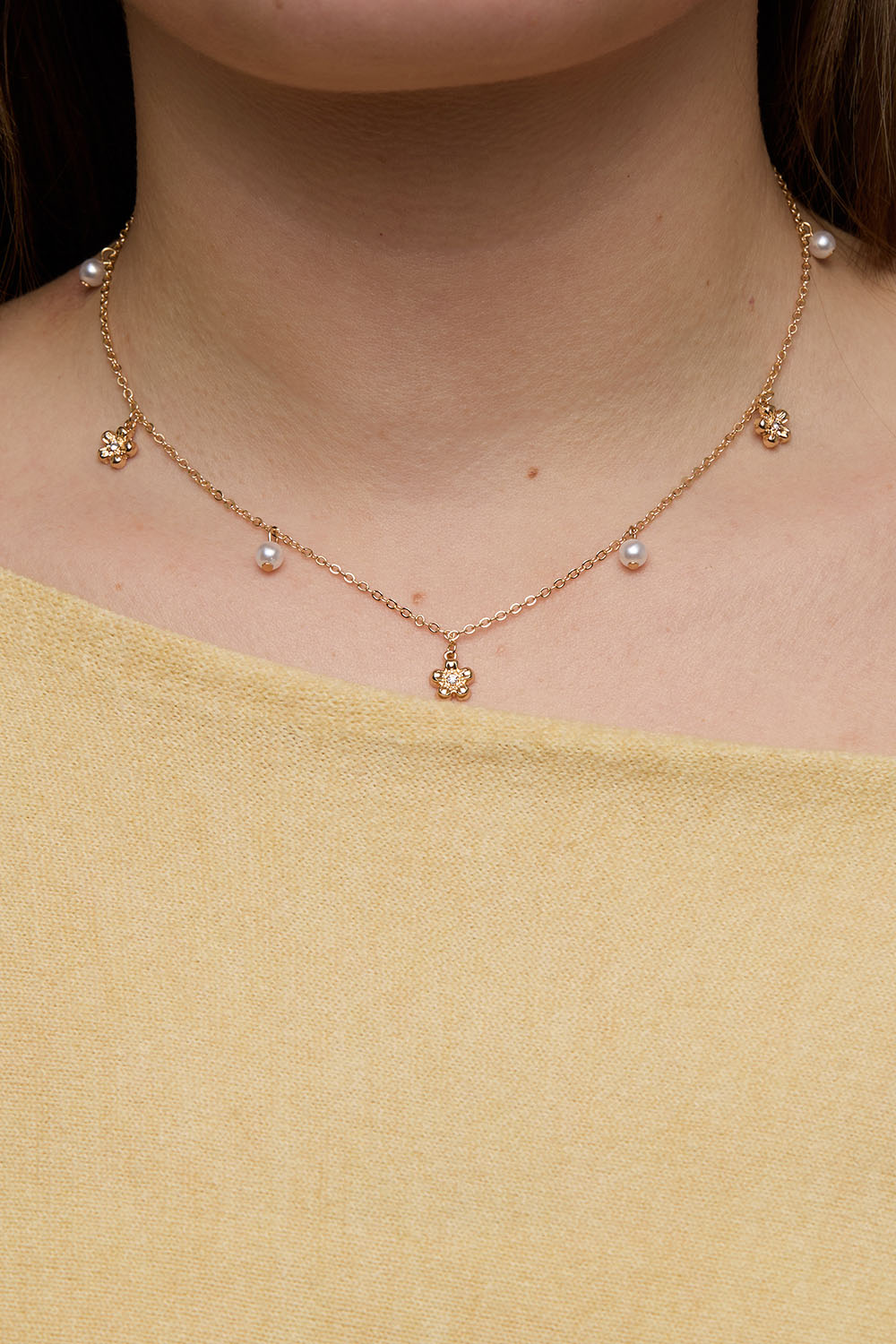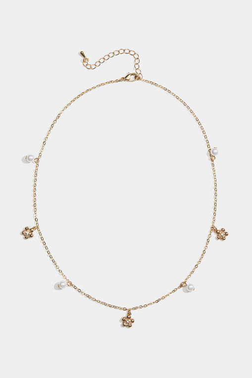 Kædehalskæde i guldfarvet metal med små vedhæng af hvide perler og blomster med glitrende glassten.