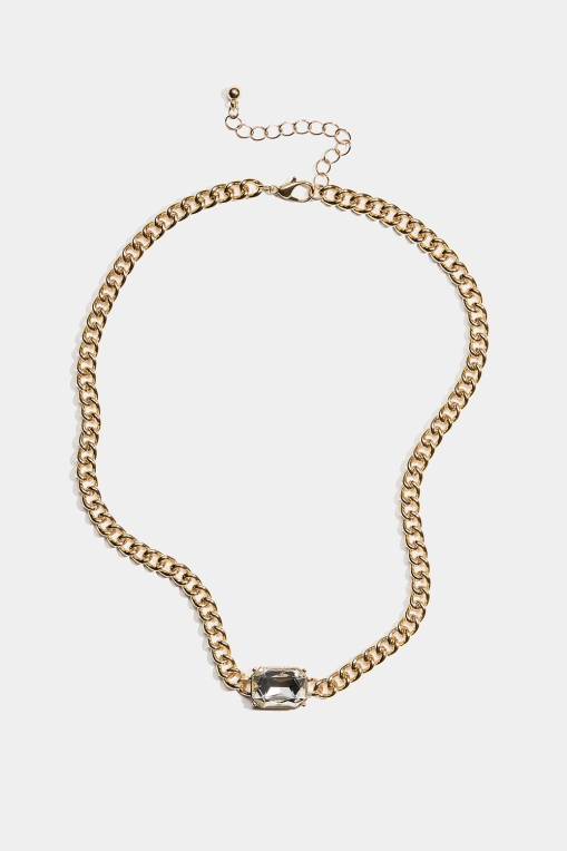 Halskæde i guldfarvet metal med grov kæde og en stor rektangulær glassten.