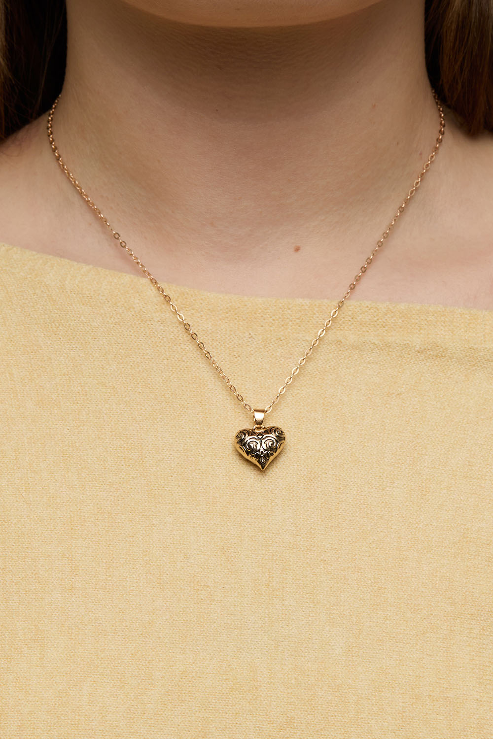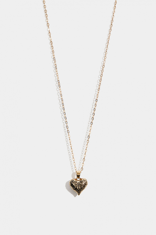 Halskæde i guldfarvet metal med et mønstret hjerte i antik stil.