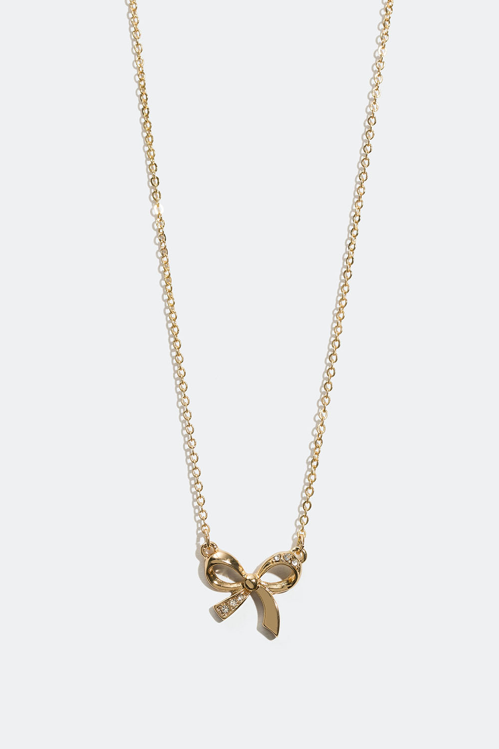 Halskæde i guldfarvet metal med sløjfe dekoreret med glassten. En stilren halskæde med glitrende detaljer.