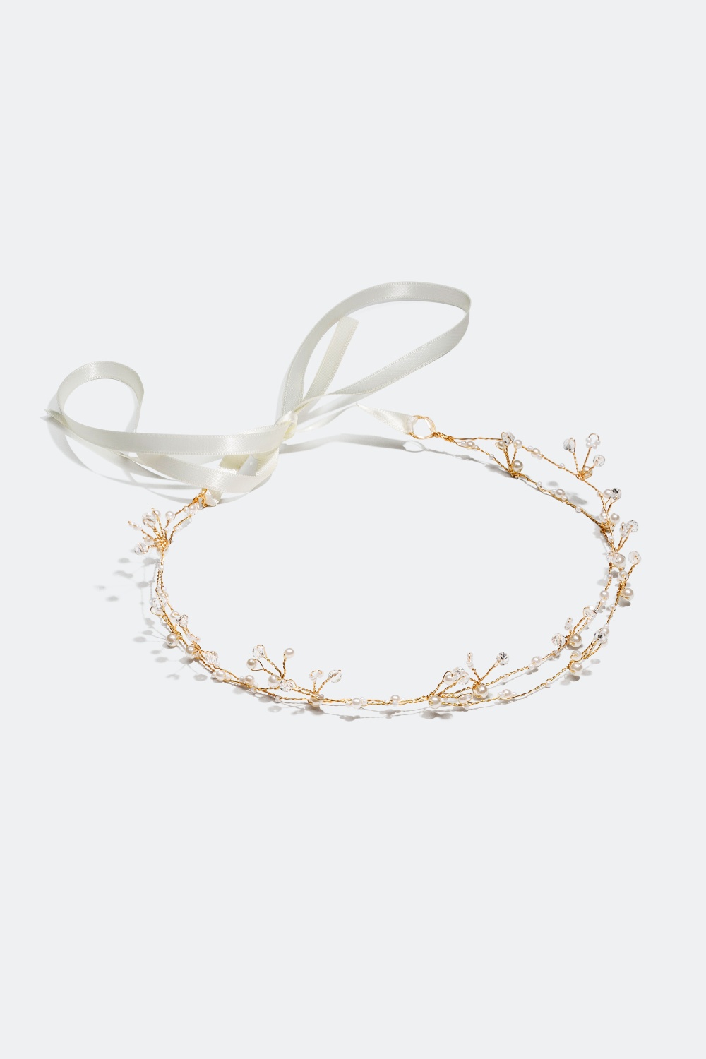 Fin og guldfarvet hårdekoration med et snoet mønster. Den er pyntet med sten i glas og perler i plastik. Hårdekorationen lukkes med et fint hvidt satinbånd.