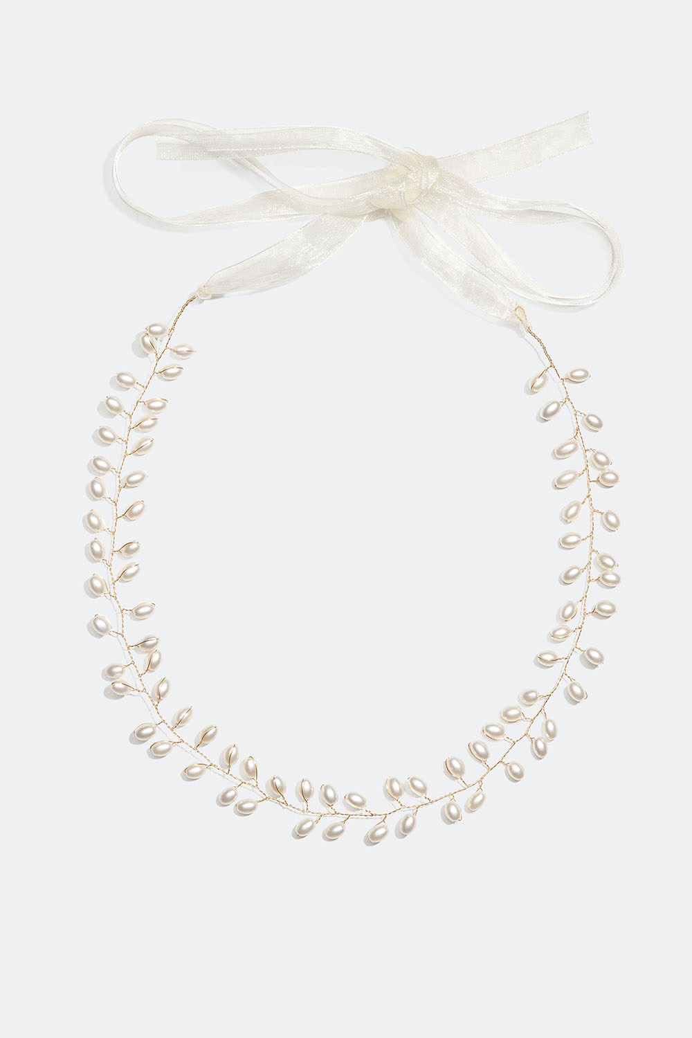 Smuk hårpynt med snoede tråde i guldfarvet metal dekoreret med hvide perler. Et perfekt hårpynt til fester og bryllupper, der bindes pænt sammen ved hjælp af hvide bånd.
