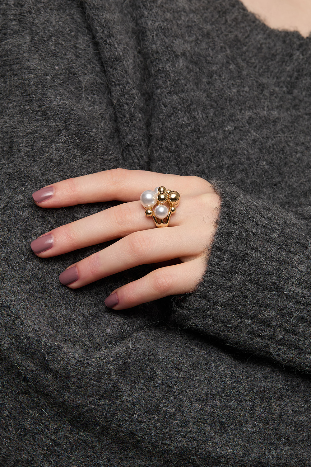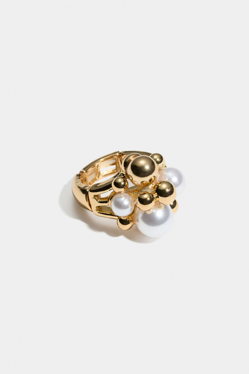 Justerbar ring i guldfarvet metal med hvide og gyldne perler.