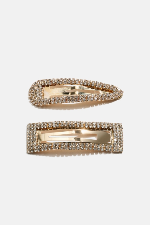 To hårspænder i guldfarvet metal dekoreret med hvide glassten. Leveres i 2-pak med en rektangulær og en dråbeformet.