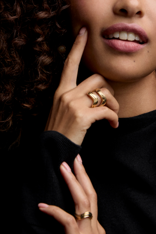 Ring i guldfarvet metal i bølgeform med riflet overflade.