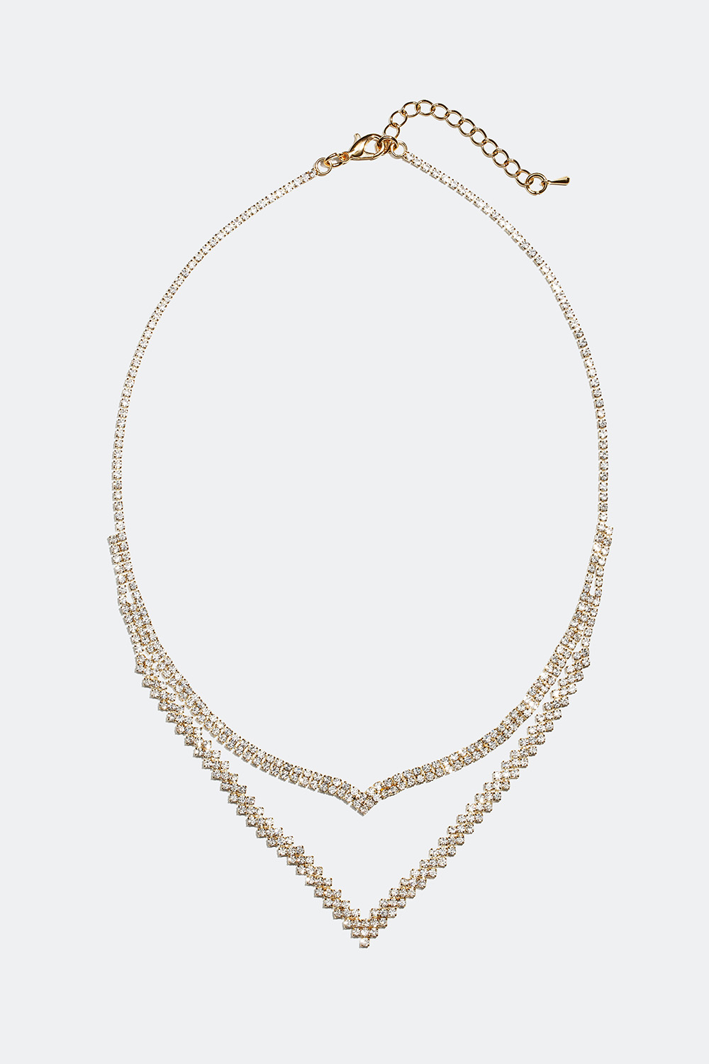 Similihalskæde i guldfarvet metal med kæder besat med glassten. Halskæden går fra en smal kæde til to lidt bredere kæder med et v-formet design. En dekorativ halskæde, som tilfører dit outfit en glitrende detalje.