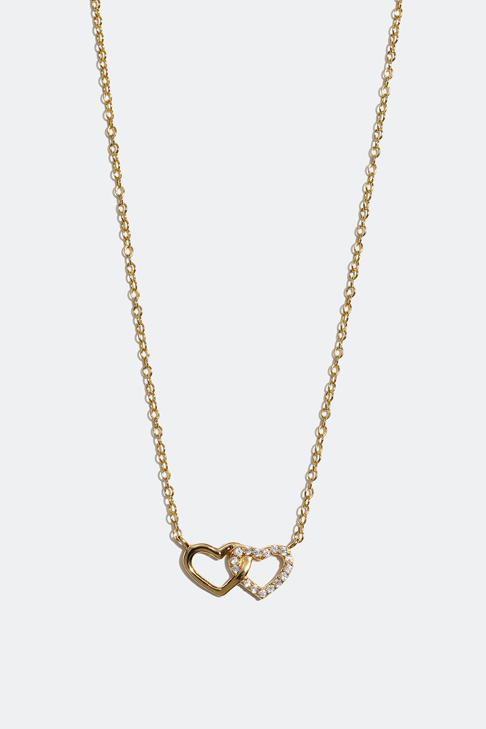 Halskæde i ægte sølv forgyldt med 18 karat guld med en kæde og to hjerter, der er kædet sammen, hvor det ene hjerte er dekoreret med små Cubic Zirconia sten. Et stilrent smykke, der passer til enhver lejlighed. Kæden er 42 cm lang, men har et ekstra øje ved 45 cm, så du kan gøre den længere efter behov.