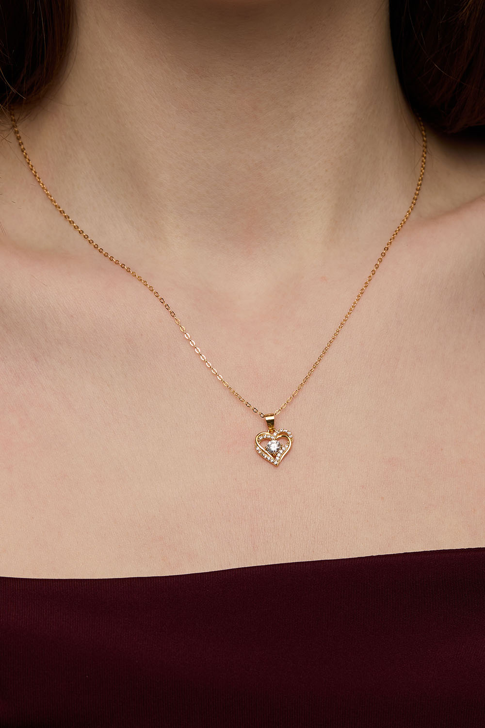 Halskæde i 18k guldpletteret ægte sølv med sammensatte hjerter, hvoraf det ene er dekoreret med sten i kubisk zirkonia. I midten af hjerterne er der en større sten.