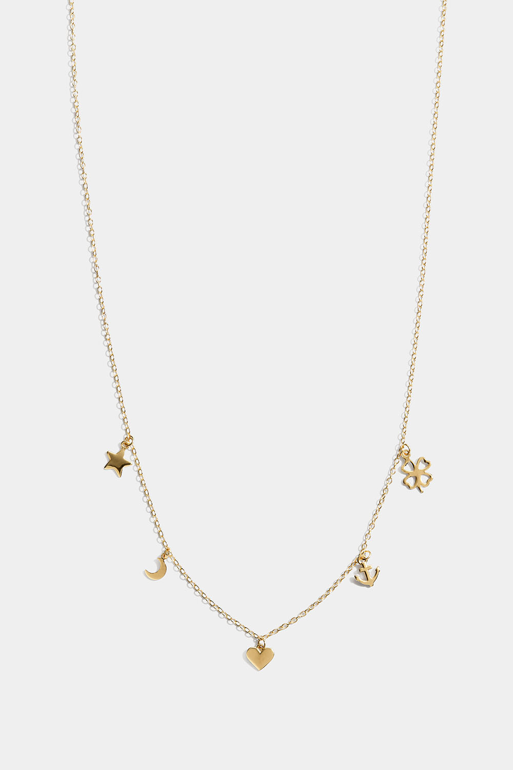 Halskæde i 18k guldbelagt sterlingsølv med små hængende charms, en stjerne, en måne, et hjerte, et anker og en firkløver.