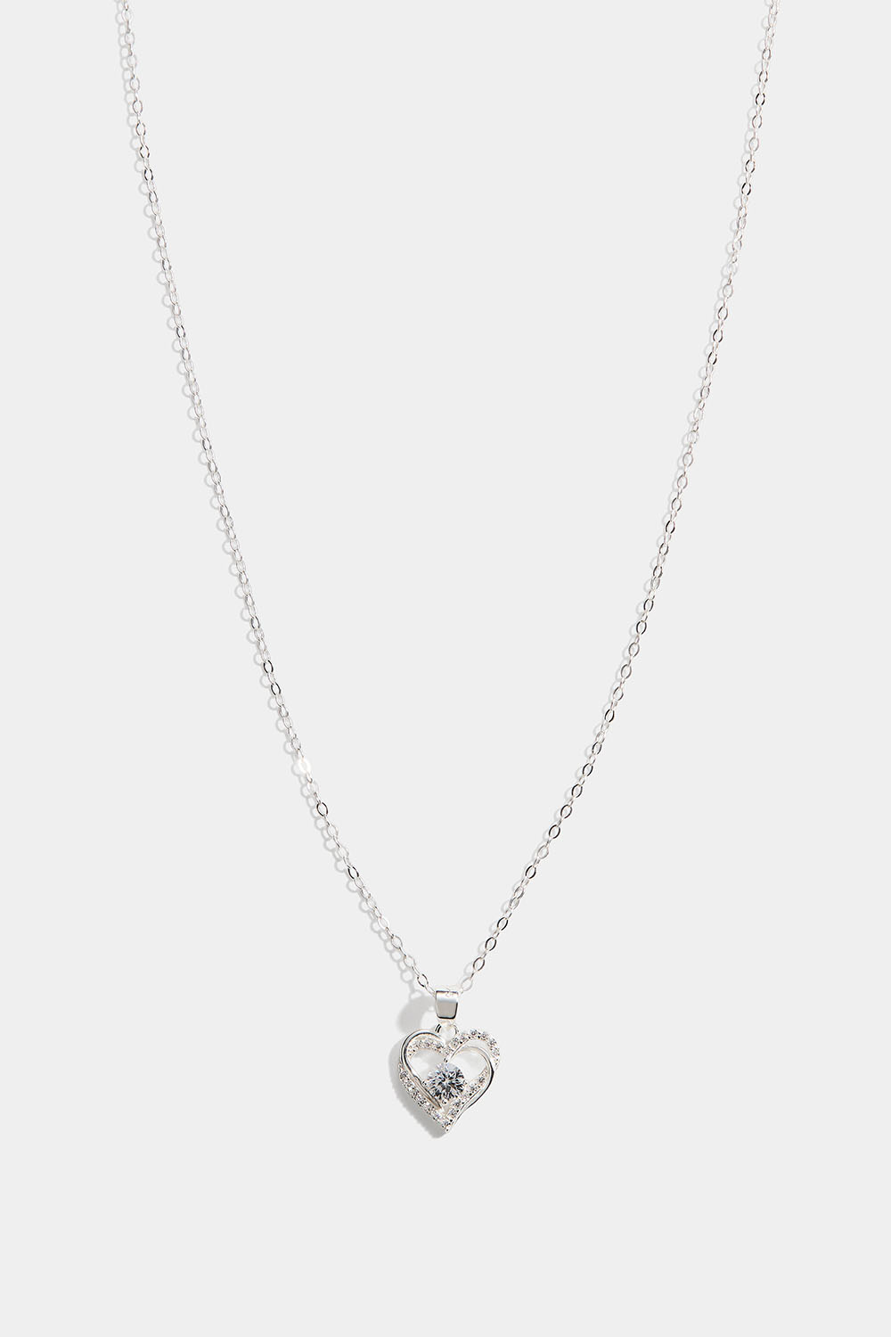 Halskæde i ægte sølv med sammensatte hjerter, hvoraf det ene er dekoreret med kubisk zirkonia-sten. I midten af hjerterne er der en større sten.