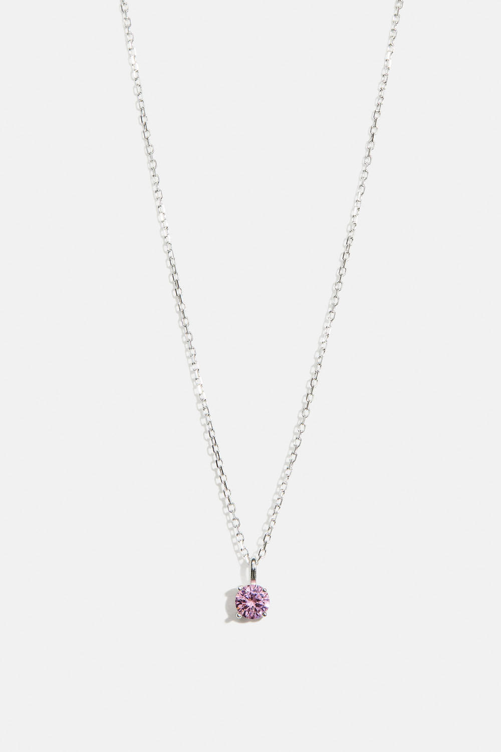 Halskæde i ægte sølv med smal kæde og en hængende rund rosa kubisk zirkonia-sten.
