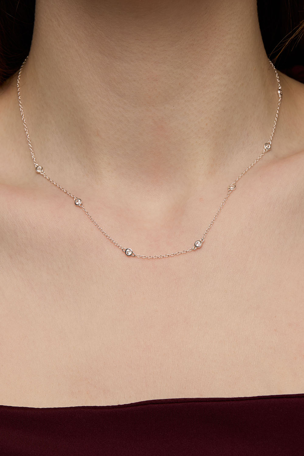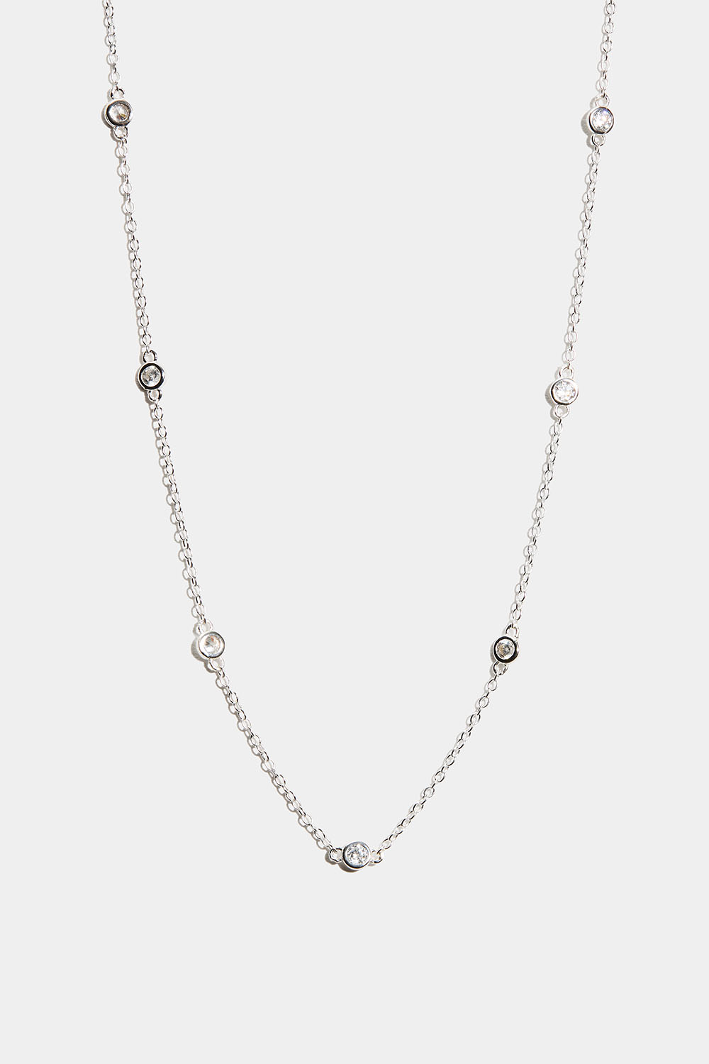 Halskæde i ægte sølv med smal kæde og små runde sten i kubisk zirkonia langs kæden.