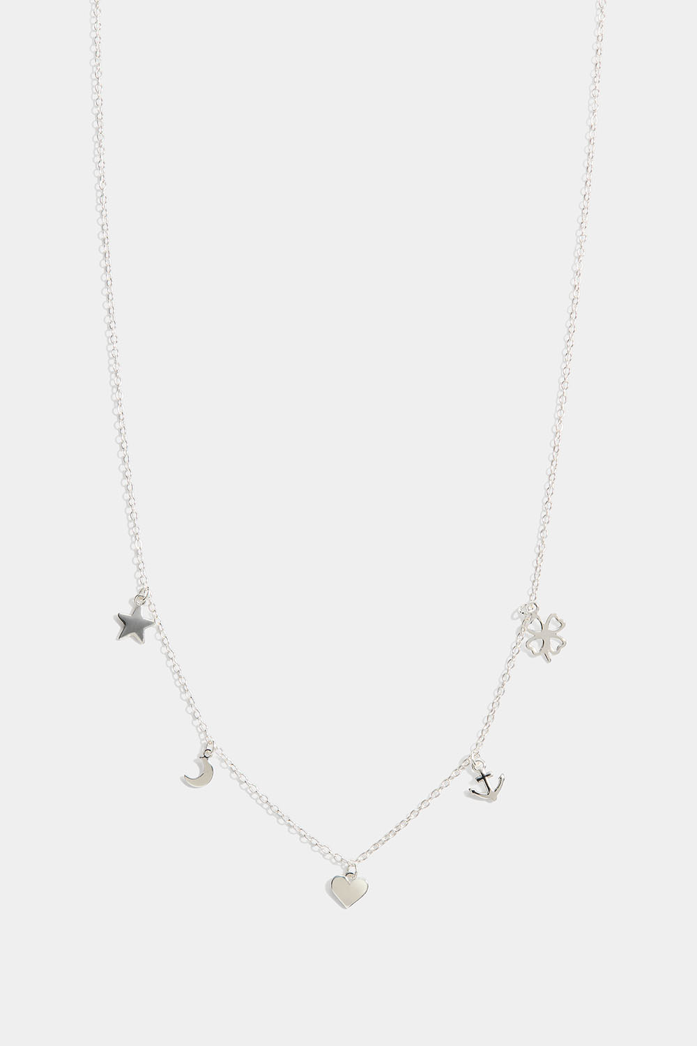 Halskæde i ægte sølv med små hængende charms, en stjerne, en måne, et hjerte, et anker og en firkløver.