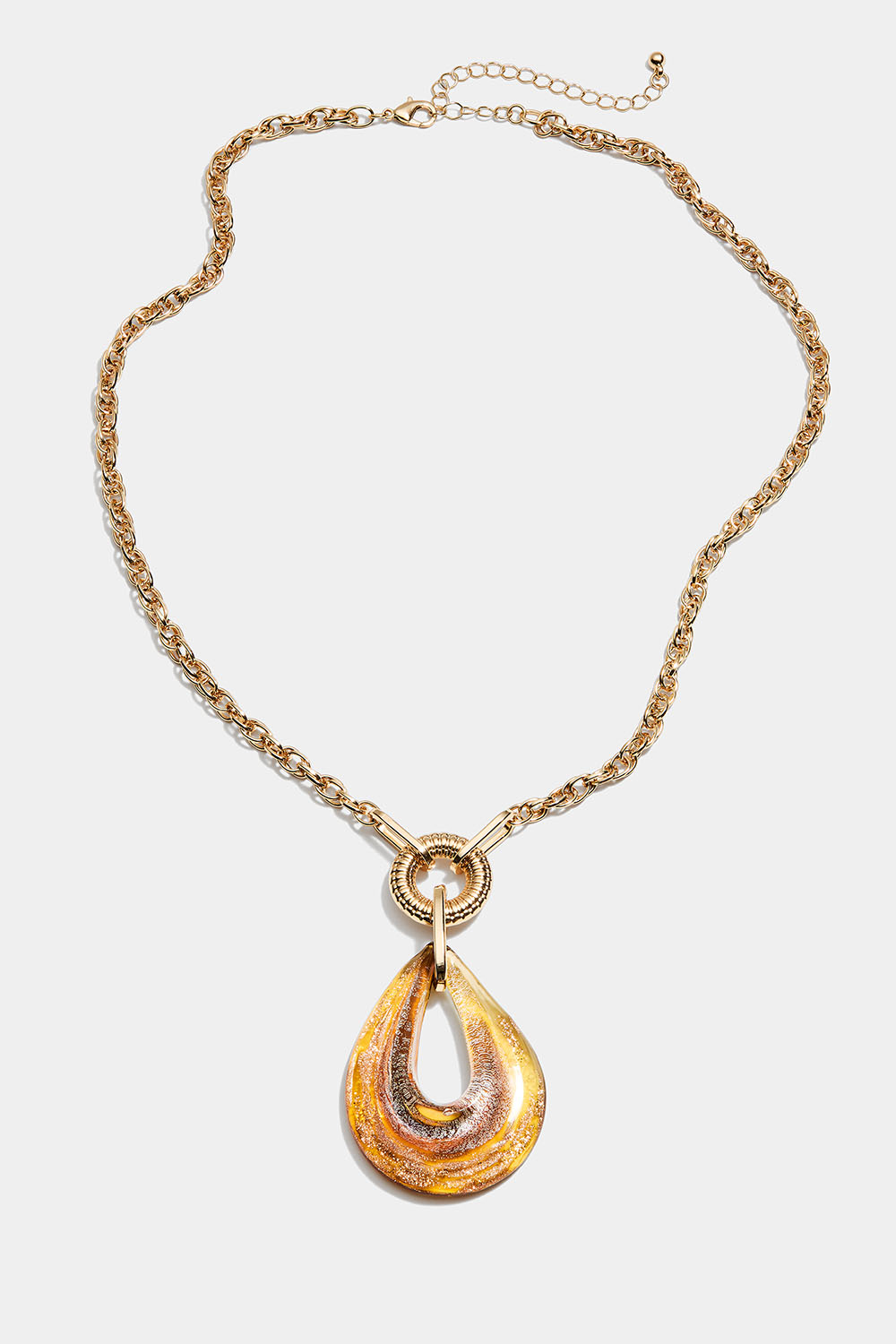 Halskæde med grov kæde og brunt dråbeformet glasvedhæng.