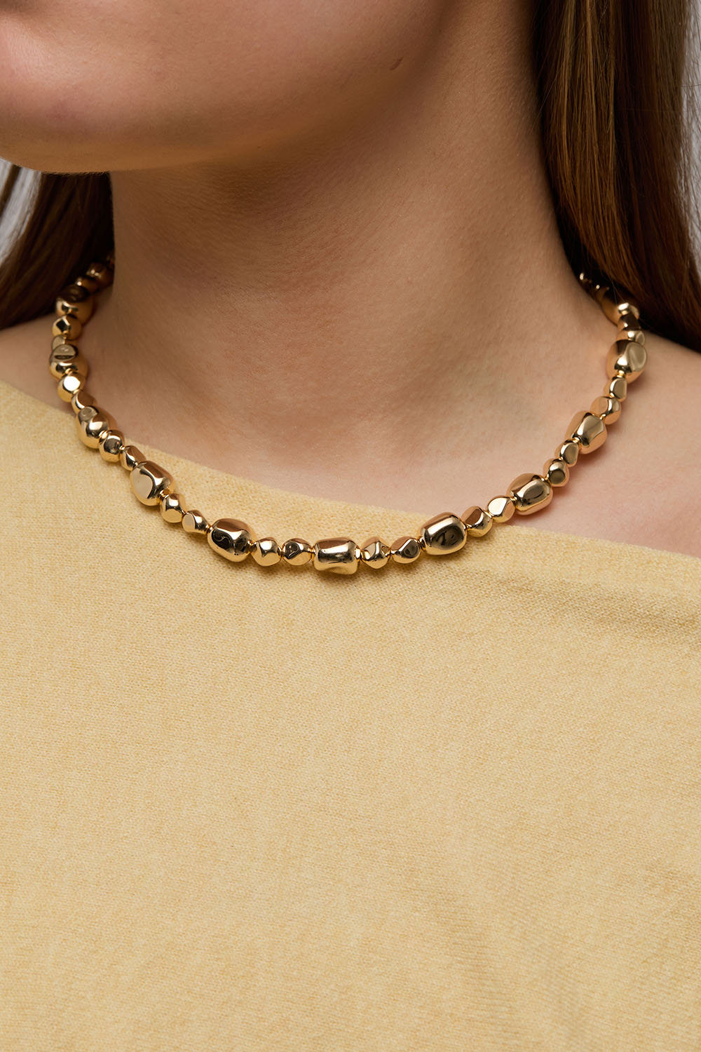 Halskæde med guldfarvede perler i forskellige størrelser med et organisk design.