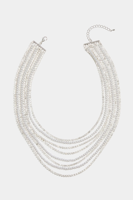 Halskæde med otte led i forskellige længder, fem med rhinsten og tre med hvide perler.