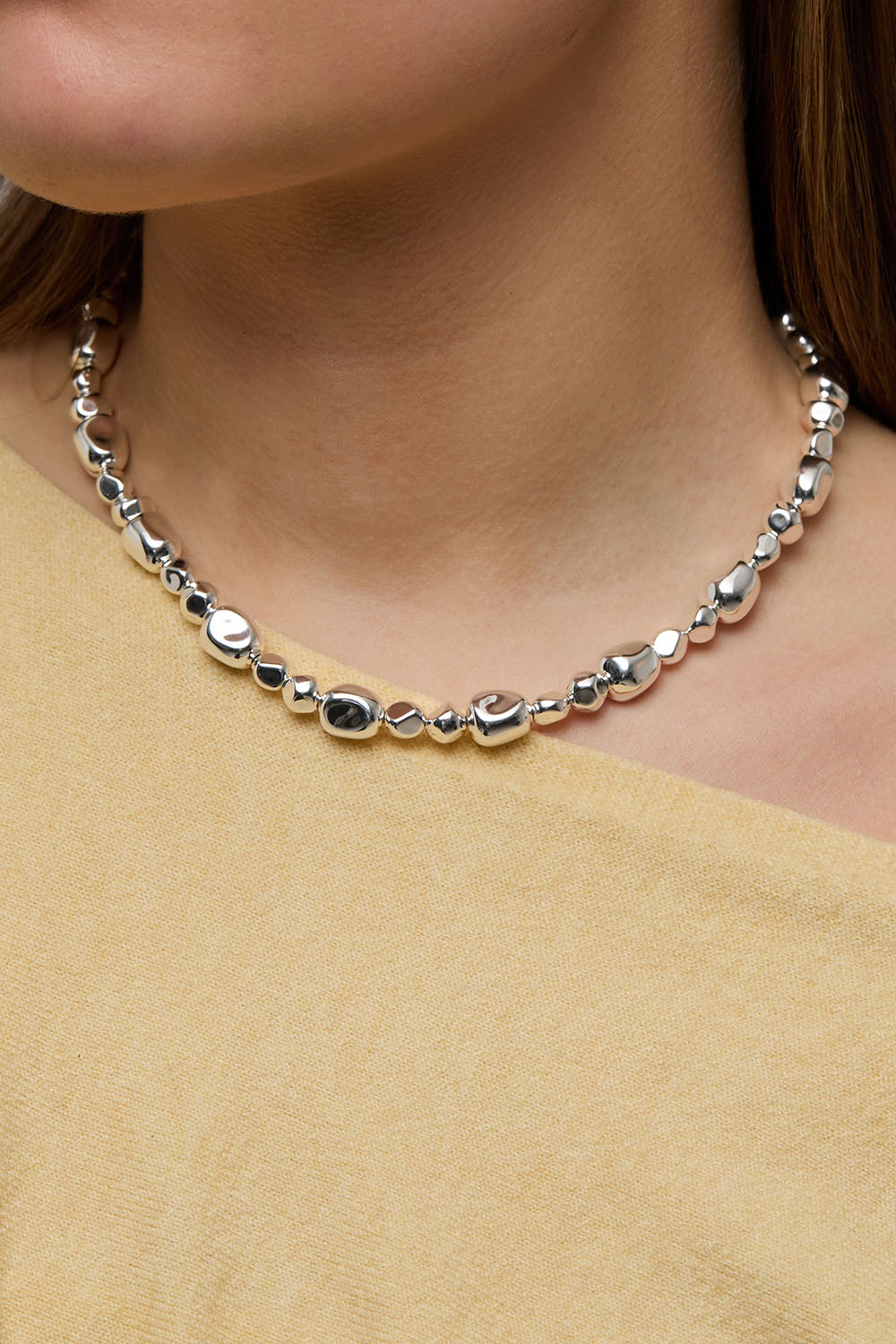 Halskæde med sølvfarvede perler i organisk design
