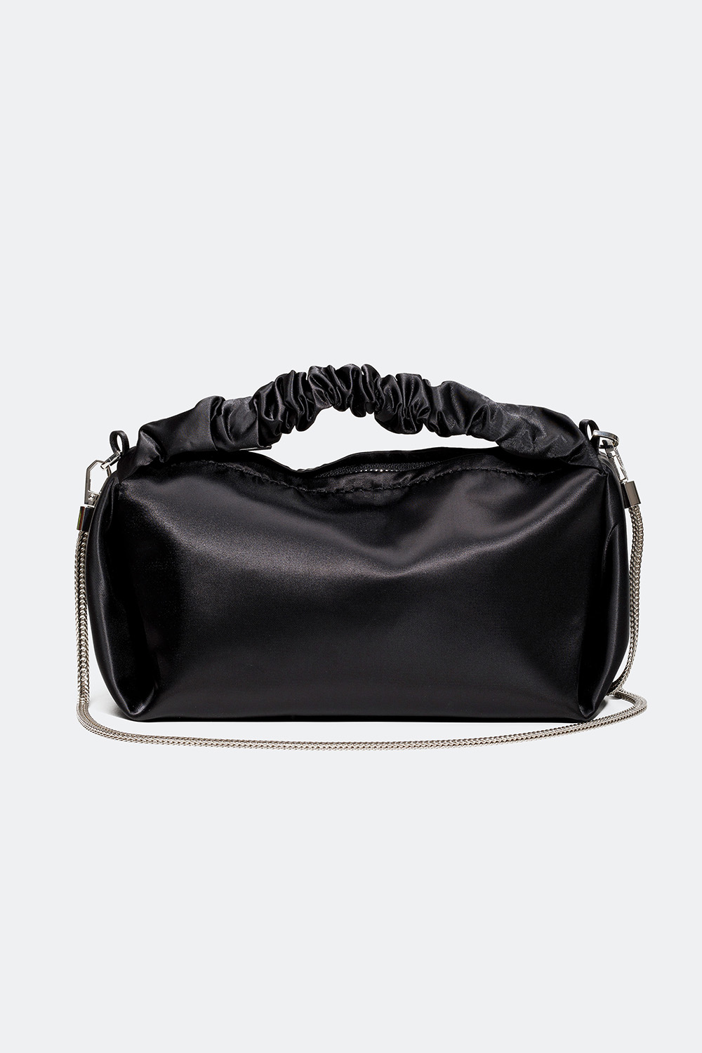 Lille stilren håndtaske i sort imiteret silke, der er perfekt til fester. Tasken kommer med en aftagelig metalkæderem, så du også kan bære tasken som cross-body eller over skulderen. Det store rum lukkes med lynlås og indeni er der også et mindre rum. En festvenlig taske i en perfekt størrelse, som har plads til alle de småting, der er gode at have ved hånden.