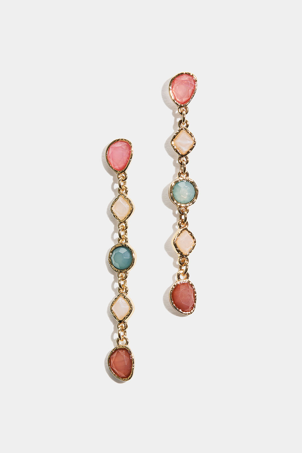 Lange øreringe med vedhæng lavet af plastiksten med organiske former og forskellige farver.
