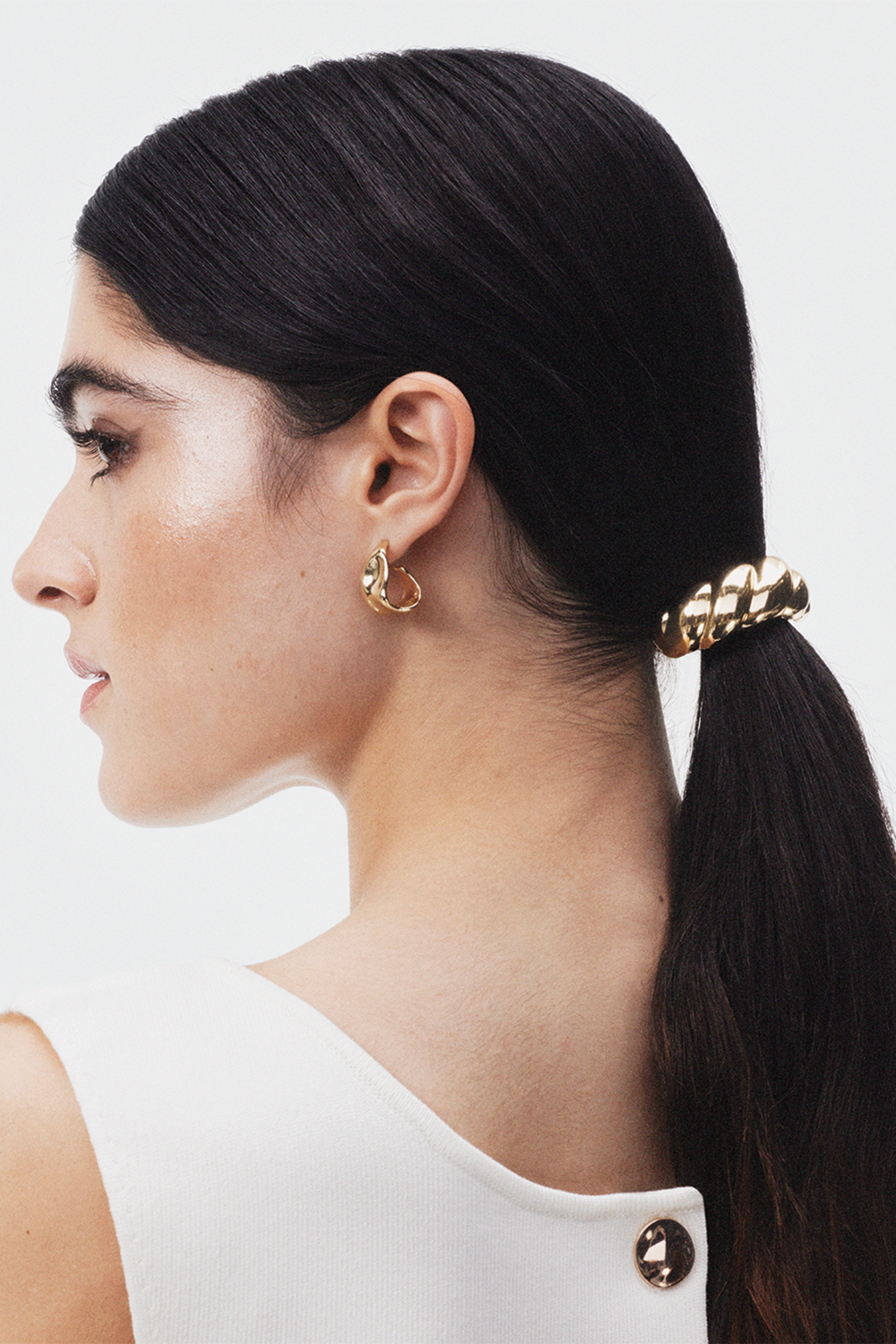 Hårelastik med guldfarvet snoet dekoration i halvmåneform.
