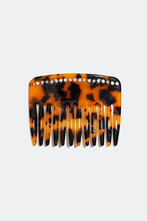 Hårkam i skildpaddemønster med bredt bagstykke, som er dekoreret med glassten. Tænderne er bredere på midten, så de sidder bedre fast i håret. Det perfekte hårtilbehør, når du vil tilføre håropsætningen en dekorativ detalje.