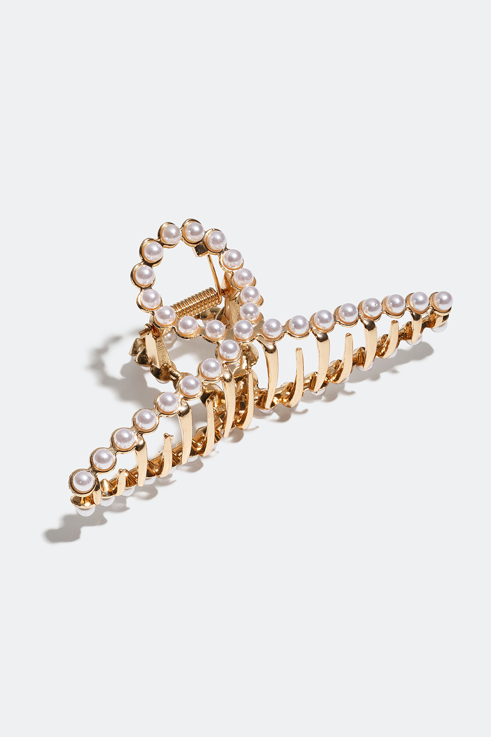 Aflang hårklemme i guldfarvet metal forsynet med hvide plastperler og en løkkedetalje, som giver en flot profil. En dekorativ hårklemme med tætsiddende tænder, der er lange ind mod midten og kortere ud mod siderne. Den er perfekt til en hurtig og enkel opsætning både til hverdag og til fest.