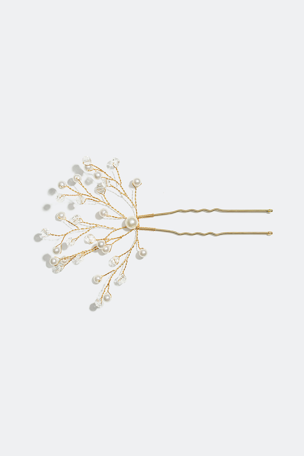 Hårnål i guldfarvet metal med snoede metaltråde, der er smukt dekoreret med hvide perler og gennemsigtige sten i plast.