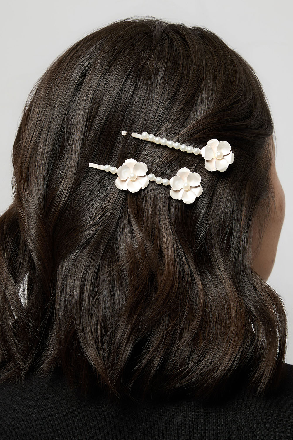 2-pak hårnåle med hvide perler og blomster. Perfekt hårpynt til flere forskellige festlige lejligheder.