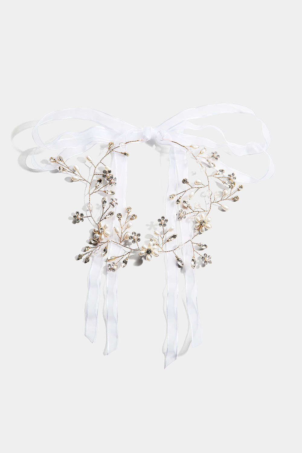 Smuk hårpynt med snoede tråde af guldfarvet metal dekoreret med blomster af glassten og hvide perler. Perfekt hårpynt til fester og bryllupper, der bindes pænt sammen ved hjælp af hvide bånd.