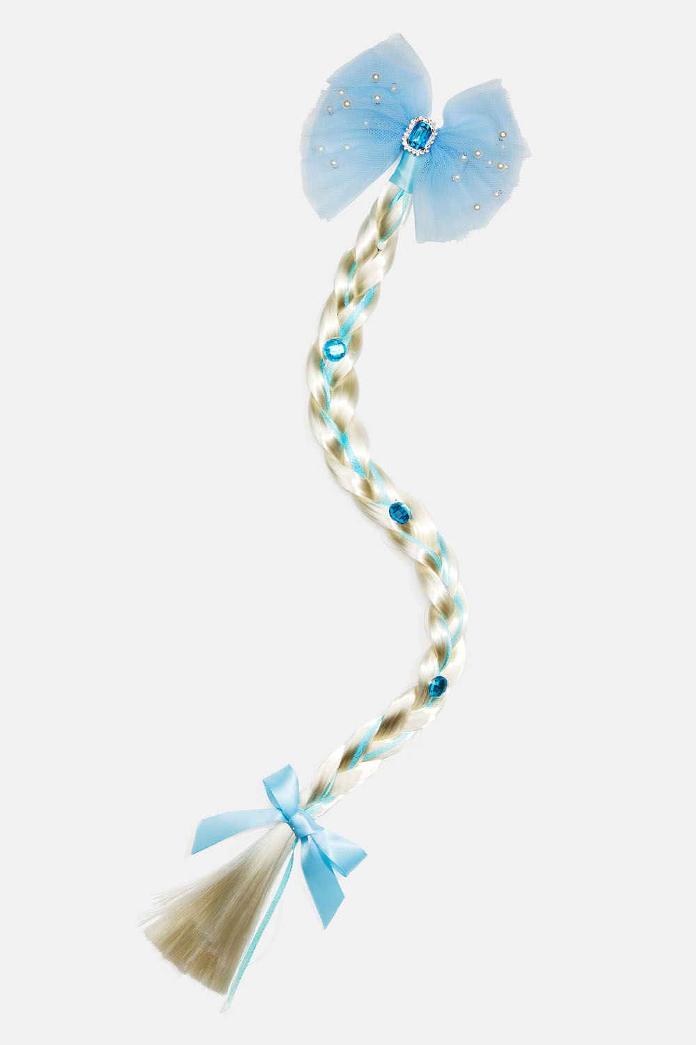 Hårspænde med blå tylsløjfe og lang blond fletning dekoreret med perler og blå plastiksten.