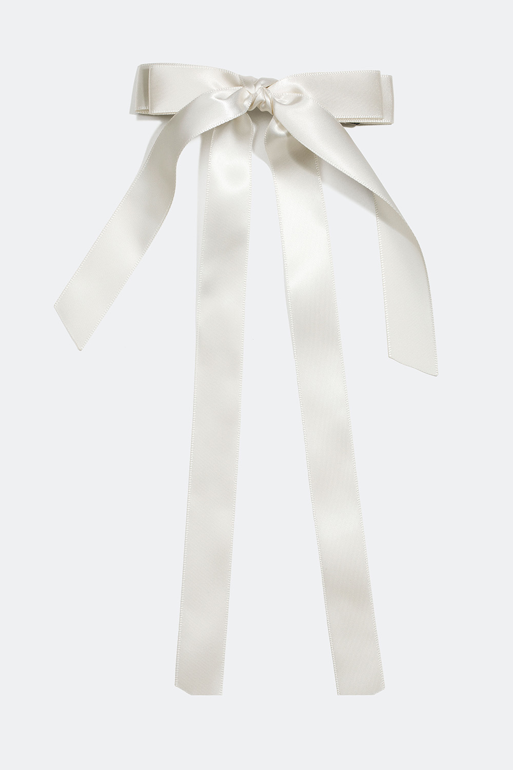 Hårspænde med en hvid sløjfe i imiteret silke med lange bånd. Et dekorativt hårspænde, der er perfekt til f.eks. en flot halv opsætning.