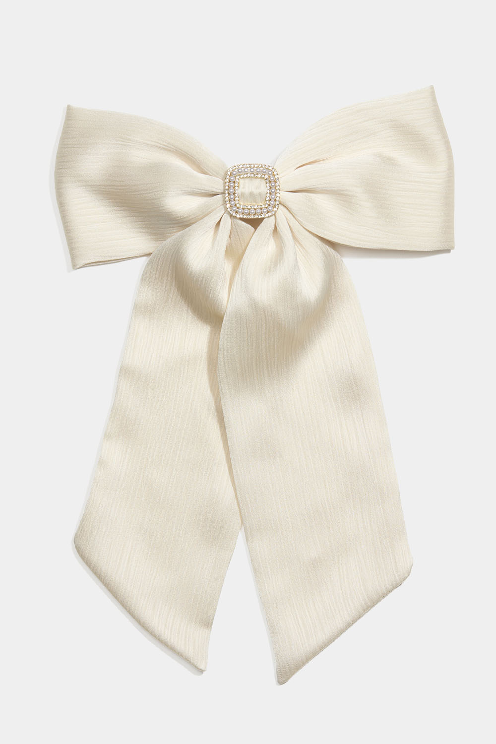 Hårspænde i metal med en stor hvid sløjfe i plisseret stof og en firkantet dekoration med rhinsten og hvide perler.